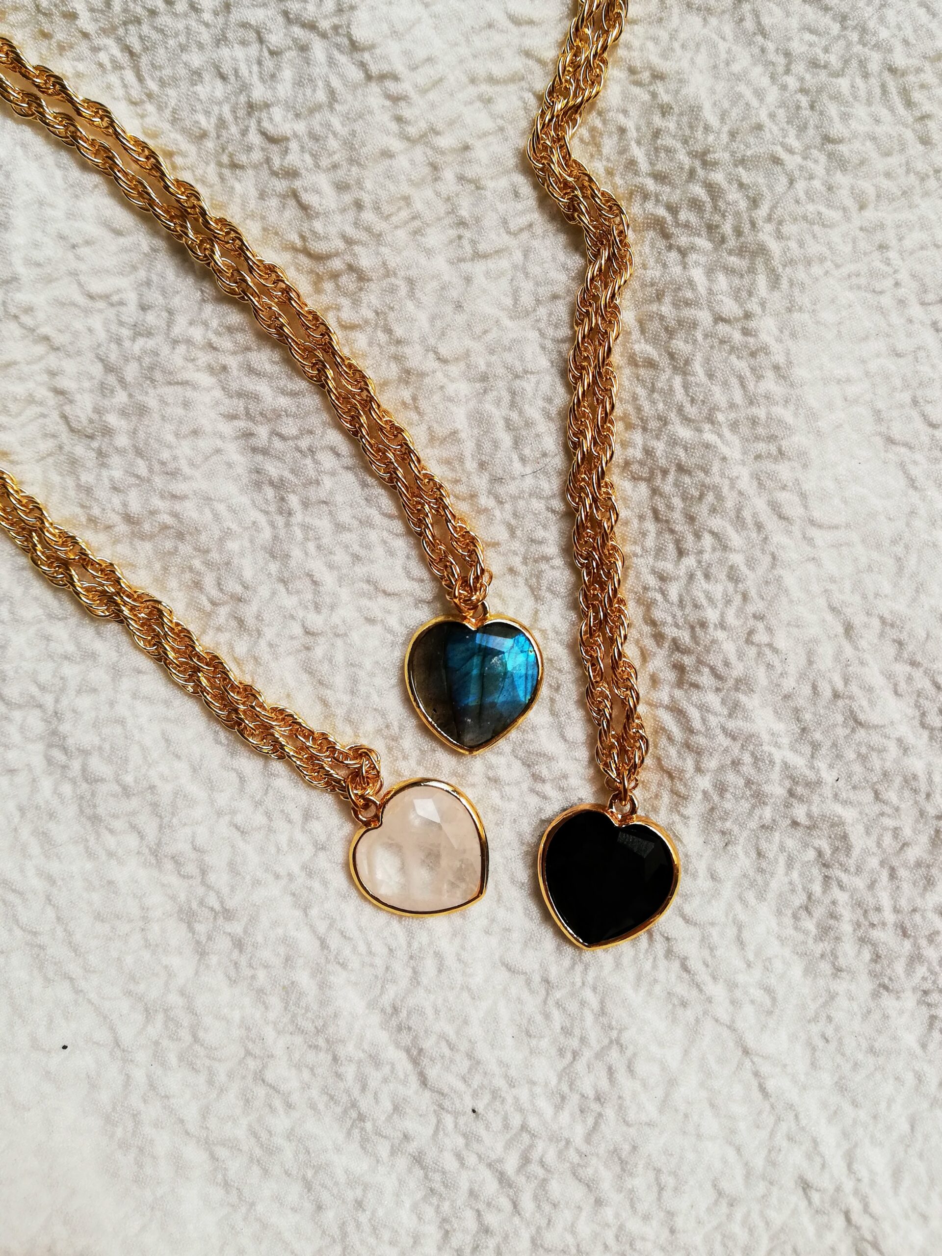 Oro de 24 quilates de alta resistencia sobre una base de latón. Para llevar solo o como una acumulación de collares. Este collar te recuerda que tu alma más profunda es amor, al igual que el universo. Tu poder creativo reside en tu capacidad para sustituir el miedo por el amor. Co-crear con el universo actuando, tomando decisiones desde el amor, siendo y difundiendo amor, es la misión de vida más hermosa que existe y se te agradecerá que aceptes esta misión. El hecho de volver a nuestra alma más profunda se ve reforzado por esta piedra de litoterapia. De hecho, la labradorita (una piedra gris verdosa con muchos reflejos multicolores) ayuda a soltar, una poderosa herramienta para la autoestima. Esta piedra también tiene un efecto calmante y favorece la comunicación (para que tu relación con los demás y contigo mismo sea más armoniosa).