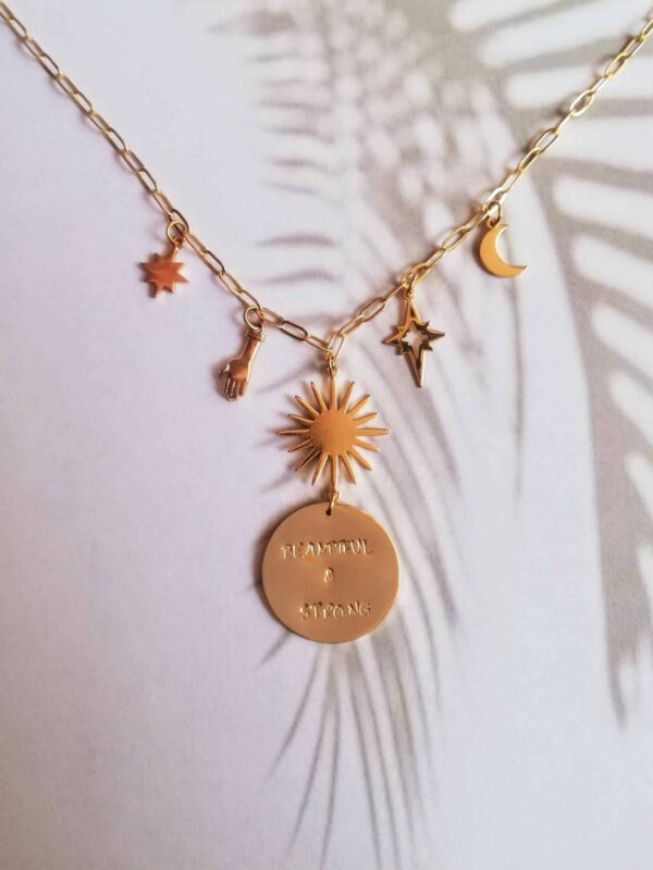 Ce mantra positif est très court mais très puissant et n’a pas été choisi au hasard. En effet chaque jour en enfilant ton collier, tu recevras un petit boost de confiance en soi qui te permettra de commencer ta journée de la meilleure des manières, prête à gravir des montagnes. Belle et forte ! Et oui ce mantra de confiance en soi te rappelle que tu n’as pas à choisir, tu peux être tout ce que tu veux ! Spirituelle et moderne, douce et ambitieuse, à l’écoute des autres et derterminée à suivre ta propre voix…