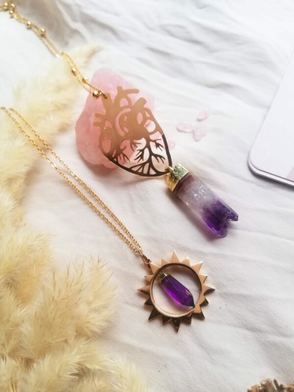 L’améthyste (pierre violette) aide à la création ce qui complète l’élément du soleil. Elle détend, calme et apaise l’esprit, dirige les pensées et les émotions vers plus de positivité.