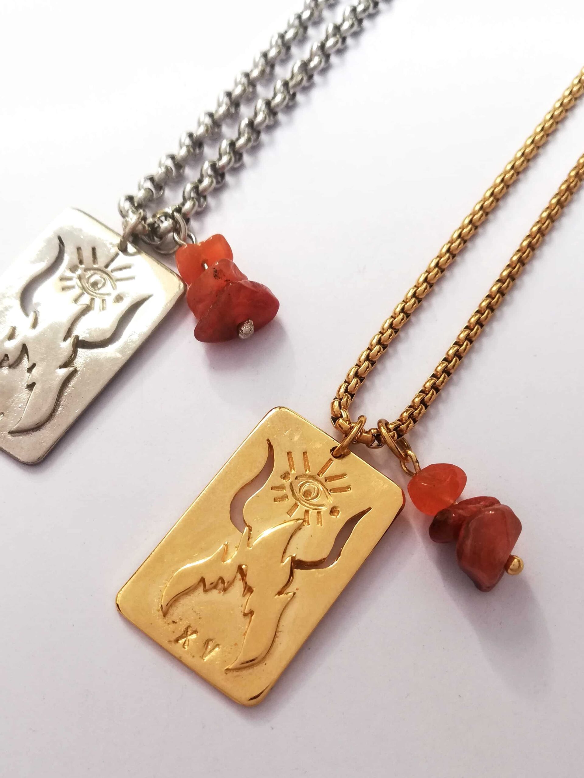 Nous te proposons également d’y associer un pendentif amulette en pierres de lithothérapie cornaline sélectionnée avec soin pour être en harmonie l’énergie de cette carte de tarot.