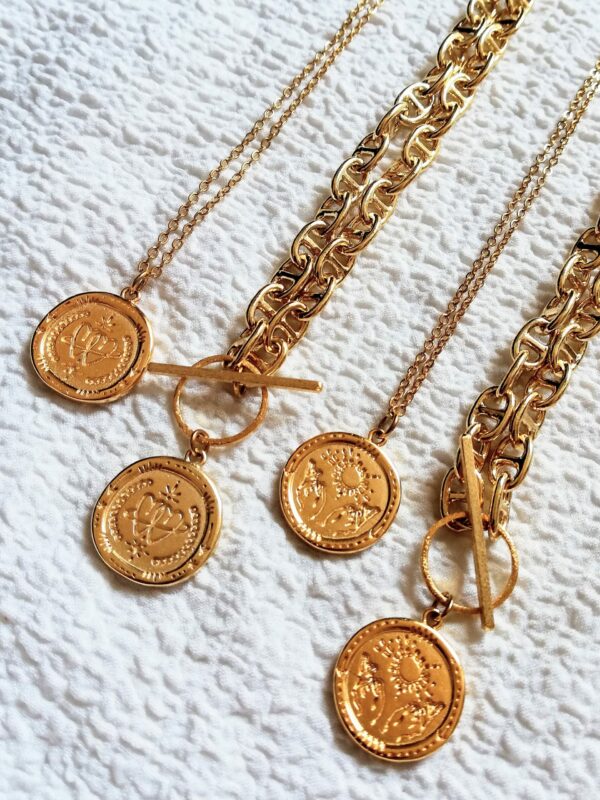 Le collier médaille Guidance est fabriqué de façon artisanale et baigné d’or 24 carats haute résistance sans nickel ni cadmium sur une base laiton. Il est long de 40 cm plus 5 cm de chaînette de rallonge, qui le rend légèrement réglable. Il existe aussi en version plus originale avec un double fermoir si tu souhaites arborer un style plus vintage !