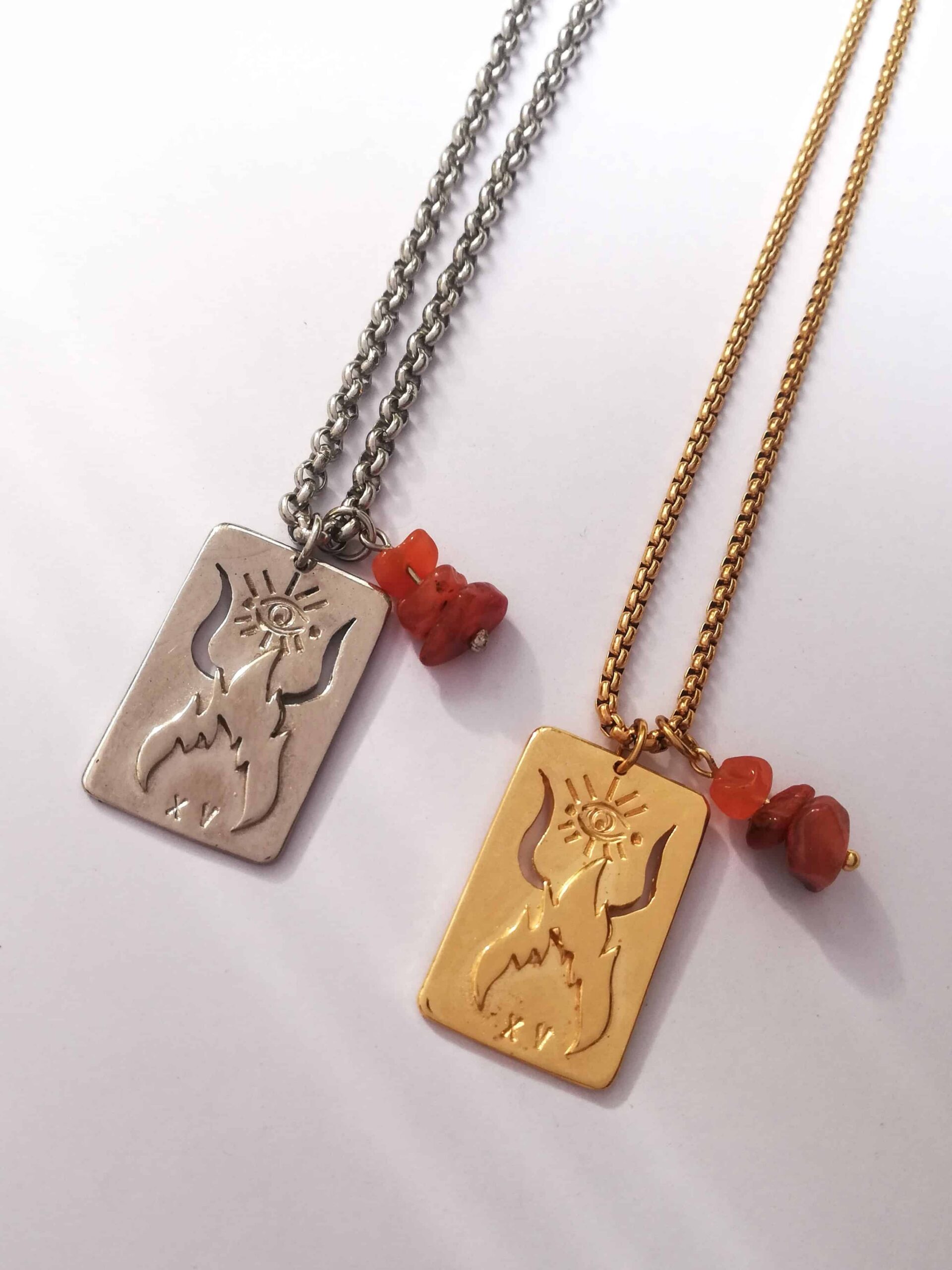 Pour créer un véritable bijou talisman, tu peux ajouter l’option pendentif amulette en pierres de lithothérapie cornaline qui accentuera l’énergie spirituelle du collier tarot Le Diable.
