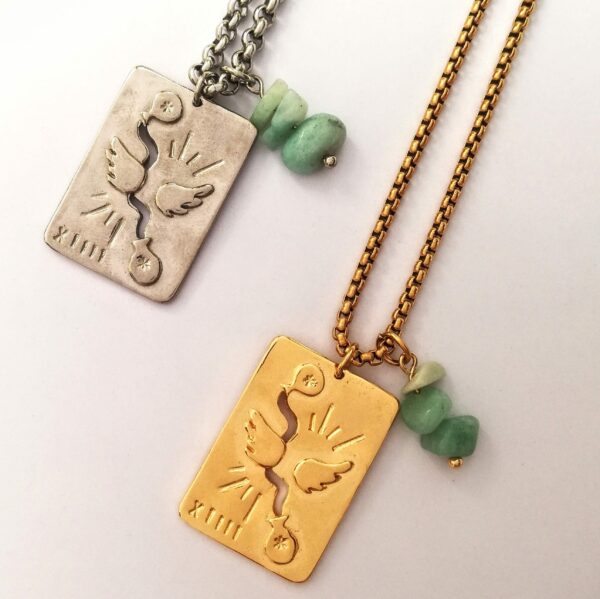 Ajoute ta propre pierre : ce collier peut être associé à un pendentif en pierres de lithothérapie amazonite choisie pour son accord parfait avec l’arcane de la Tempérance.
