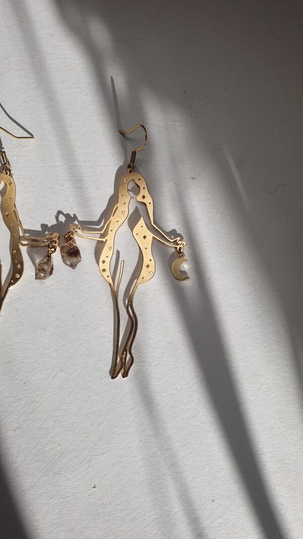 Représentant l’énergie féminine et la nature cyclique de la vie, elles rendent hommage à cette déesse qui, chaque nuit, chevauche son char lunaire à travers le ciel. Comme Séléné qui incarne les phases de la lune, ces boucles d’oreilles symbolisent la beauté du renouveau, la puissance des cycles naturels et la lumière douce mais intense de la féminité divine. Un bijou pièce unique (une seule paire fabriquée) qui relie la force céleste à l’essence de chaque femme.