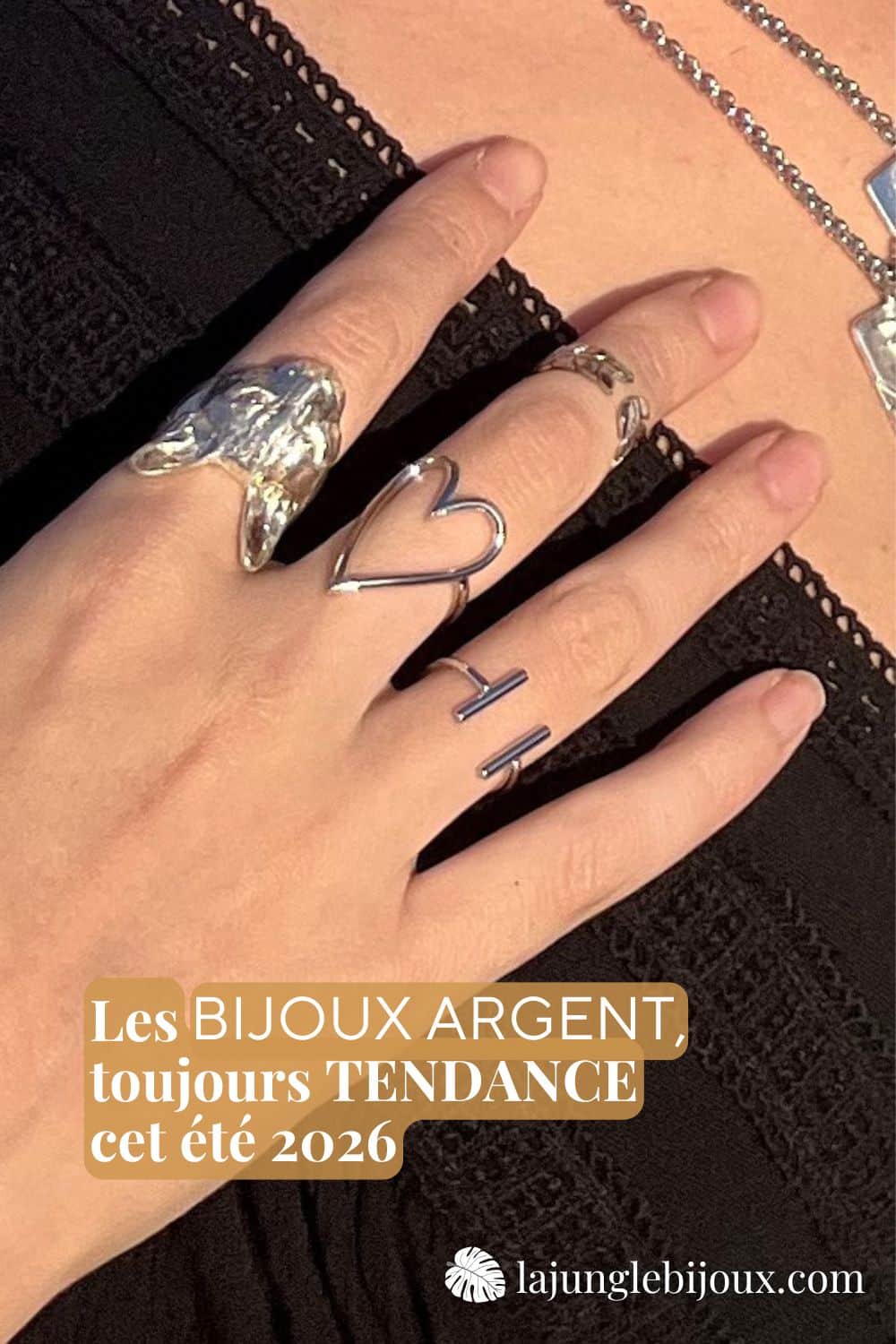 On parle souvent d’or, mais dans les tendances été 2026, les bijoux en argent tirent aussi bien leur épingle du jeu. L’argent apporte une fraîcheur minérale, presque aquatique, qui colle parfaitement avec l’ambiance mer et nature de la tendance bijoux été 2026. Une bague en argent à côté d’une bague vague dorée, des bijoux argent associés à d’autres dorés pour un effet mixte and match très tendance : les possibilités sont infinies.